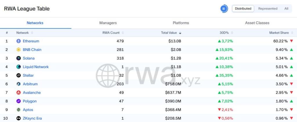 Ethereum leads tokenized real-world assets with $13 billion in total value and 479 projects, commanding 60.22% market share across distributed networks.